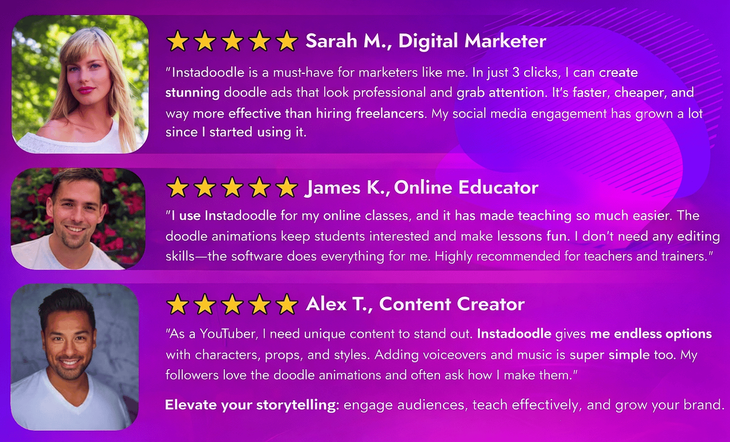 Whether you’re creating explainer videos, ads, lessons, or social content, InstaDoodle™ blends AI automation, drag-and-drop simplicity, and full creative control—helping you produce professional doodle videos that educate, engage, and convert in minutes.
