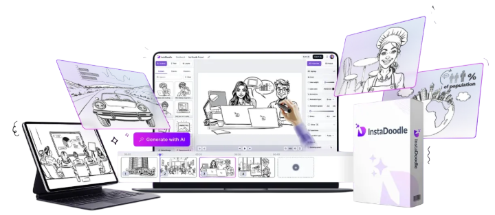 InstaDoodle™ is designed to make doodle video creation simple and affordable for all users. With its intelligent AI engine, easy drag-and-drop tools, and cloud-based access, anyone can create high-quality videos on any device—without expensive software or technical skills.